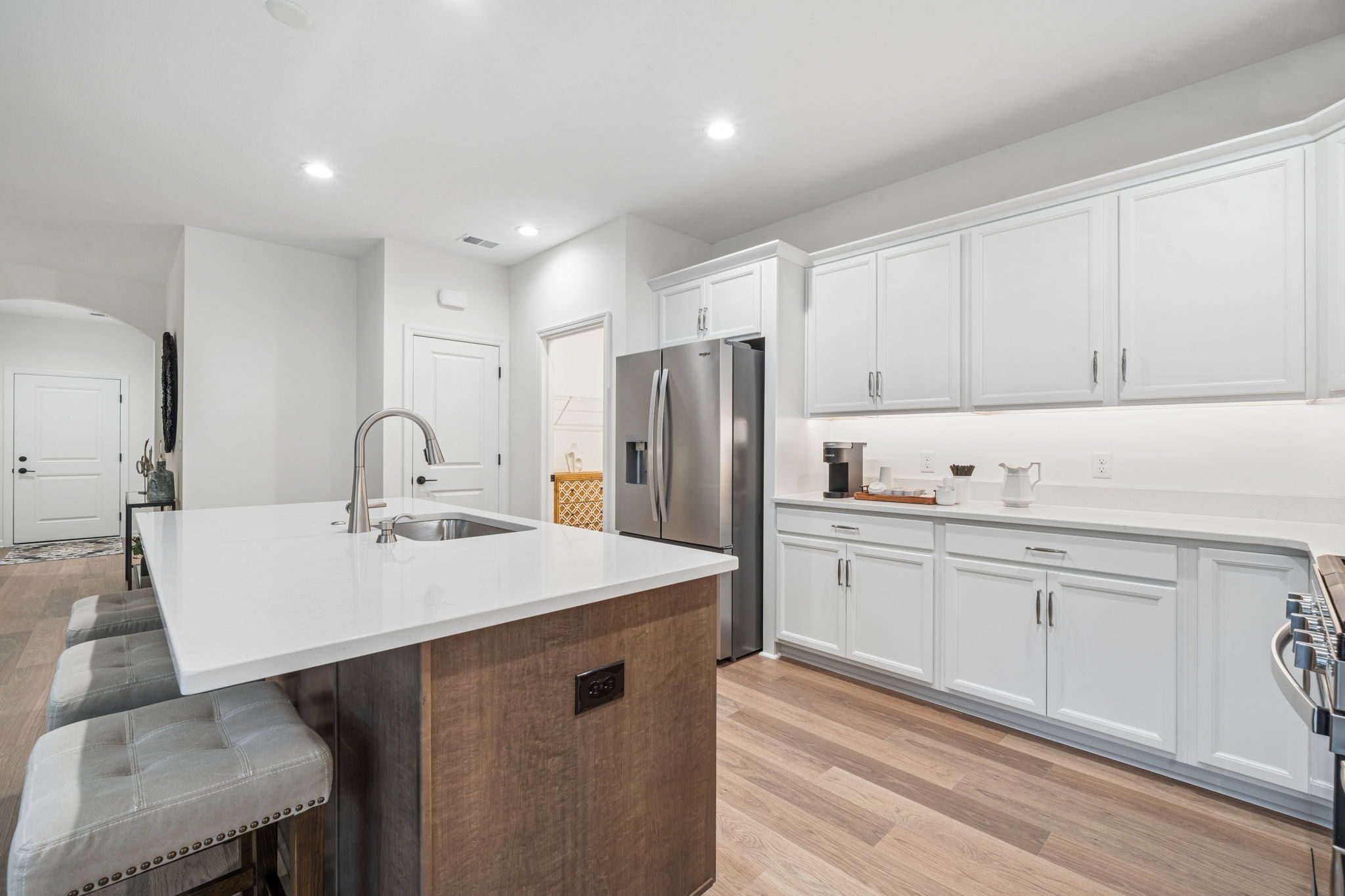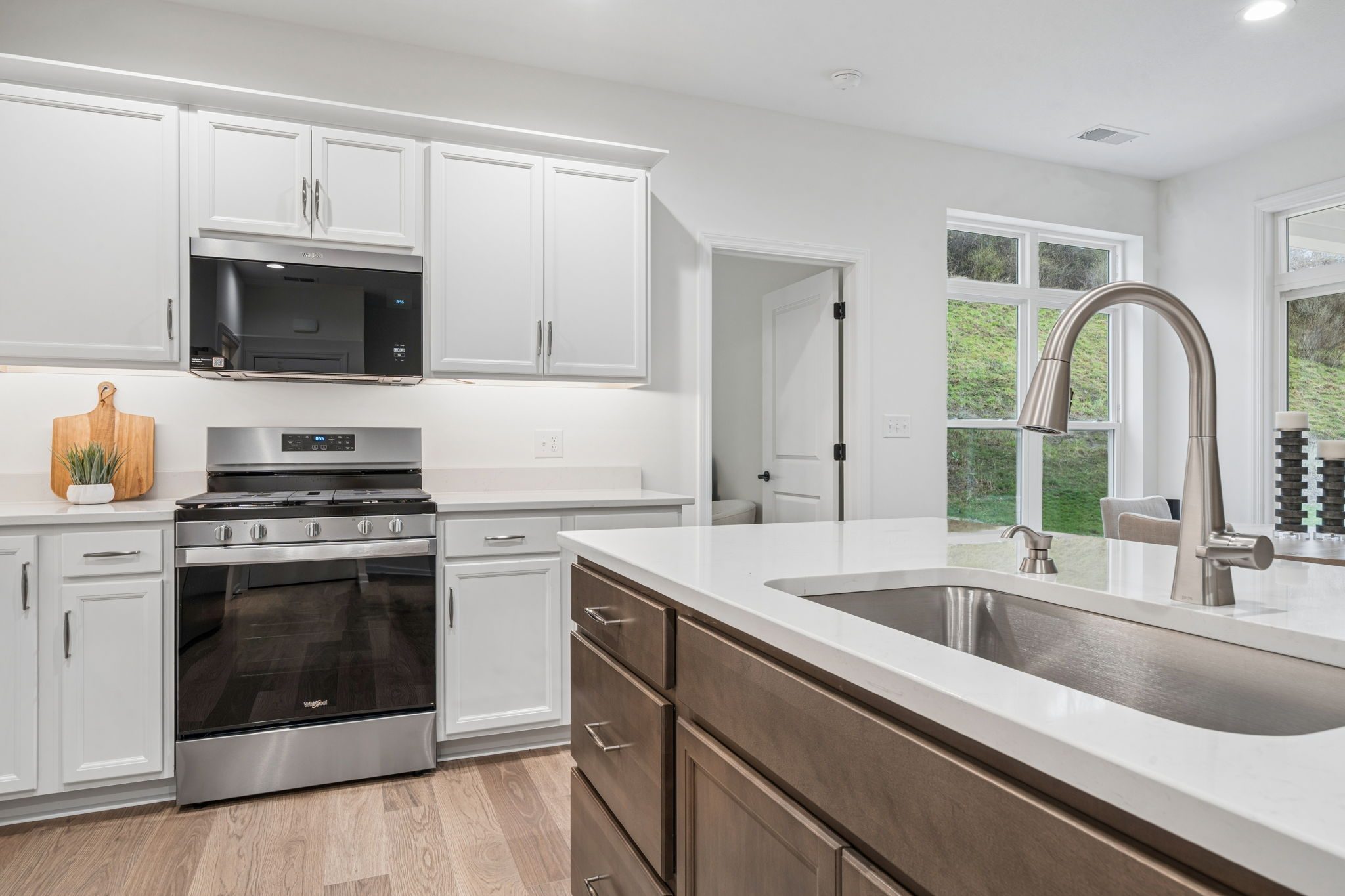 Additional clerestory windows fill the space with natural light, and the living room is anchored by a white painted wood fireplace with black granite surround, creating a striking focal point. The kitchen is equipped with Whirlpool stainless steel appliances, including a French door refrigerator, gas range, microwave, and dishwasher, paired with white upper and lower cabinets, a pop of color on the burlap-toned island, and beautiful quartz countertops.